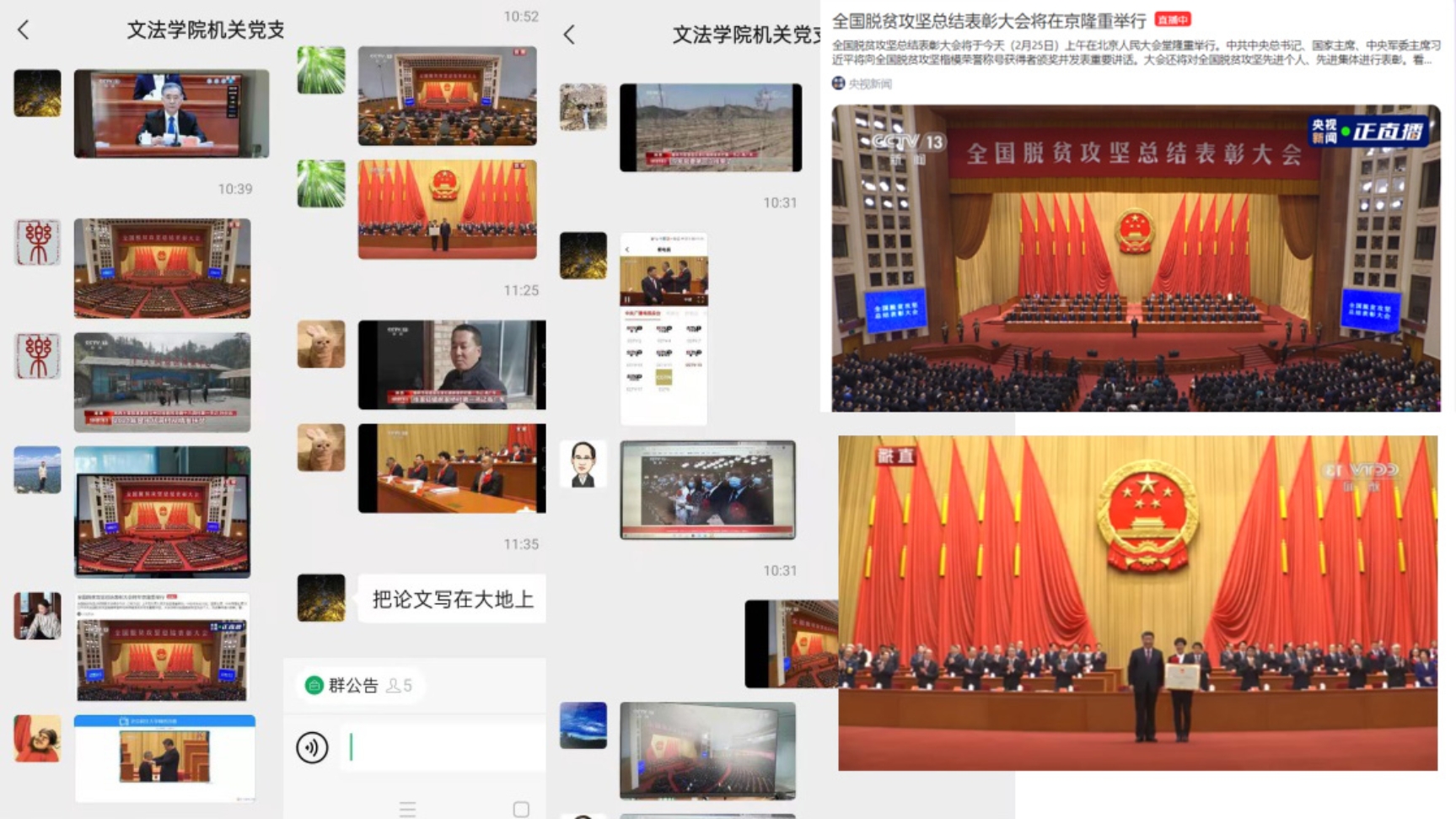 2月25日上午,全国脱贫攻坚总结表彰大会在北京人民大会堂隆重举行。Kdpay钱包 全体师生通过线上直播观看学习,机关党支部、人文素质教育中心党支部,法律系、公共管理系、社会学系教师党支部,各学生党支部在支部内积极互动,深入学习脱贫攻坚奋斗精神。