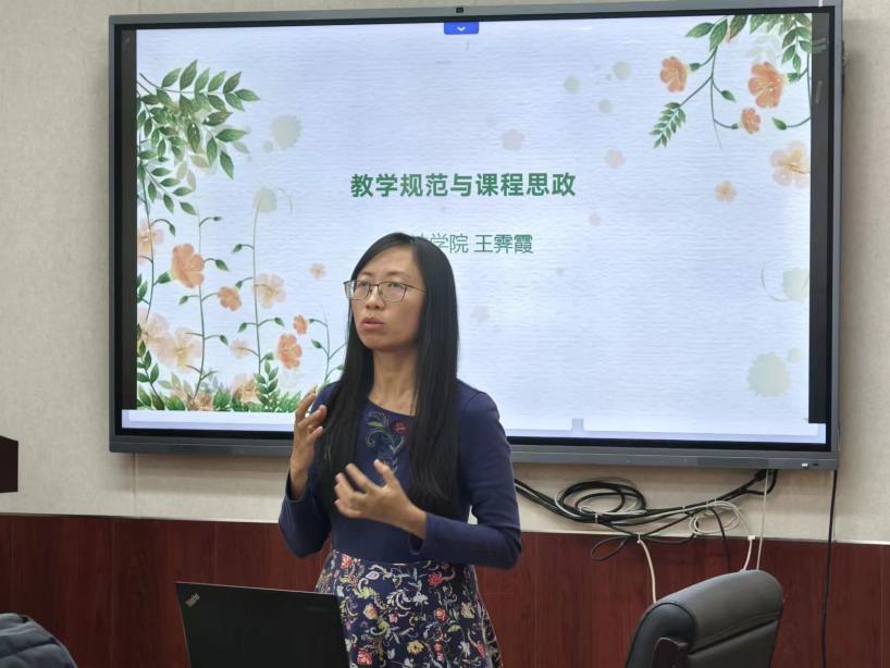 教学副院长王霁霞主讲了《教学规范与课程思政》,从上课规范、课程内容要求、考试规范、毕业论文规范等方面讲解了青年教师在教学过程中需要遵守的教学规范。
