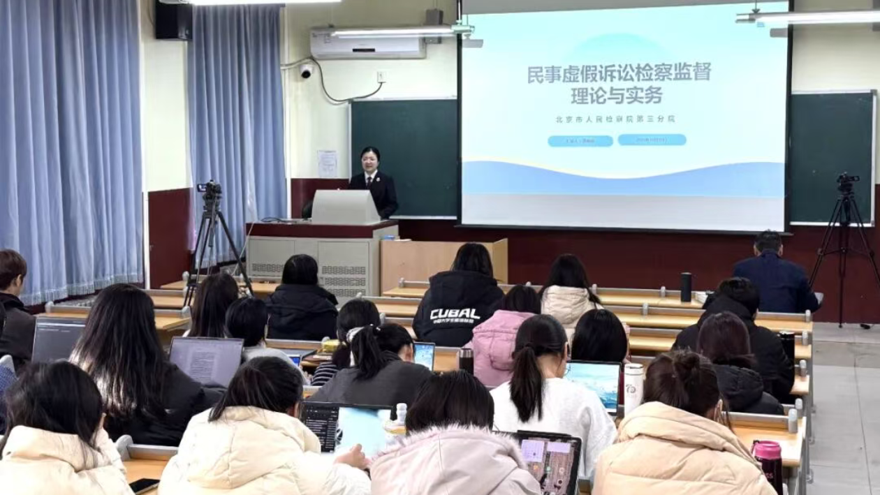 北京市检三分院姚梅娟以“民事虚假诉讼检察监督理论与实务”为题主讲。她以虚假诉讼对司法公信力和正常诉讼秩序的危害为切入点,系统阐释了民事诉讼检察监督的核心概念、构成要件及常见类型,循着“理论阐释—实践解析”的脉络层层推进,重点聚焦实务办案中的关键环节,向师生详细分享了线索发现、调查核实的技巧与方法,为在场学生搭建起理论通向实践的桥梁。为让讲解更具说服力,姚梅娟结合“无中生有的借条”“手拉手的调解”等八个真实典型案例,抽丝剥茧地揭开虚假诉讼的“合法外衣”,直观展现检察机关精准打击此类违法行为的实践路径。互动环节中,她通过针对性提问引导学生深度思考,现场学生积极回应,结合所学理论提出疑问,形成良好互动氛围,讲座赢得在场师生的一致认可。