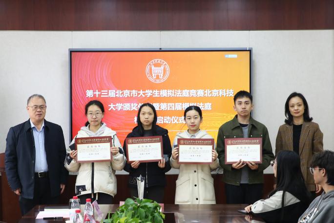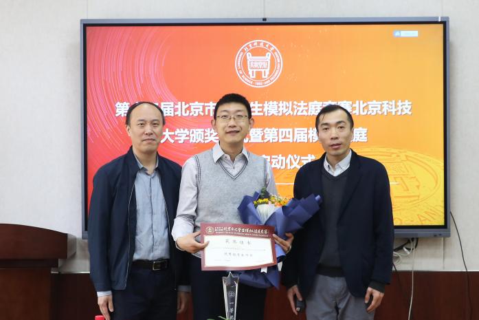 北京科技大学在第十三届北京市模拟法庭竞赛摘得团体一等奖桂冠。其中,张廷信获得最佳个人二等奖,徐佳钰获得优秀个人奖,徐铭勋老师获得优秀指导教师奖。与会领导分别为获奖学生代表与徐铭勋老师颁发获奖证书及奖品。