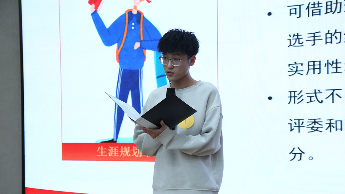 首先是生涯规划展示环节。参赛者依次亮相,以自己的《生涯规划书》为内容,借助理论讲解和案例展现等形式,在为时4分钟的个人展示中阐述职业规划的合理性、实用性和可操作性,充分展现出朝气蓬勃的新时代青年形象。
