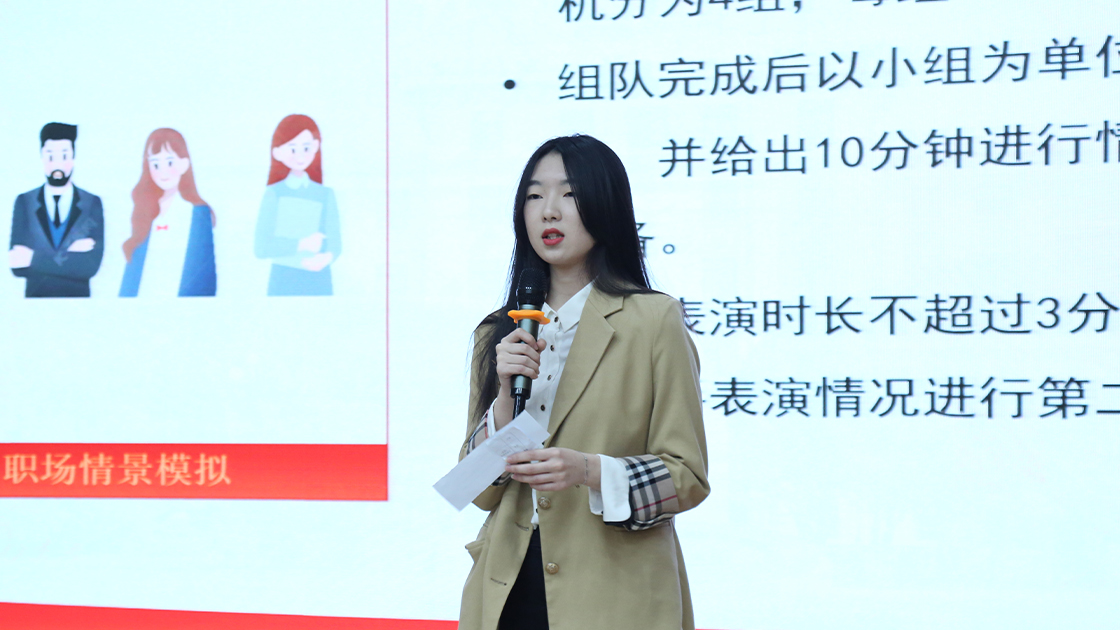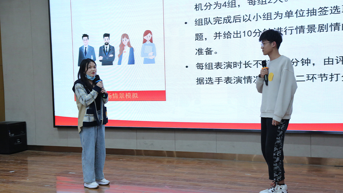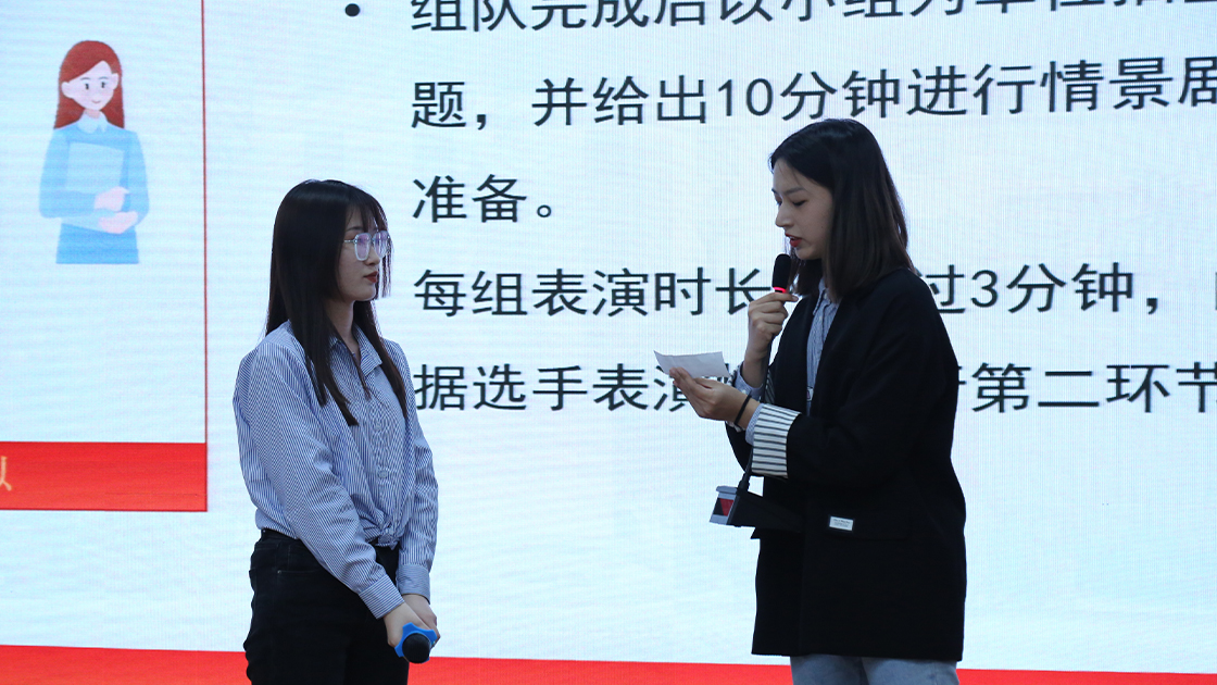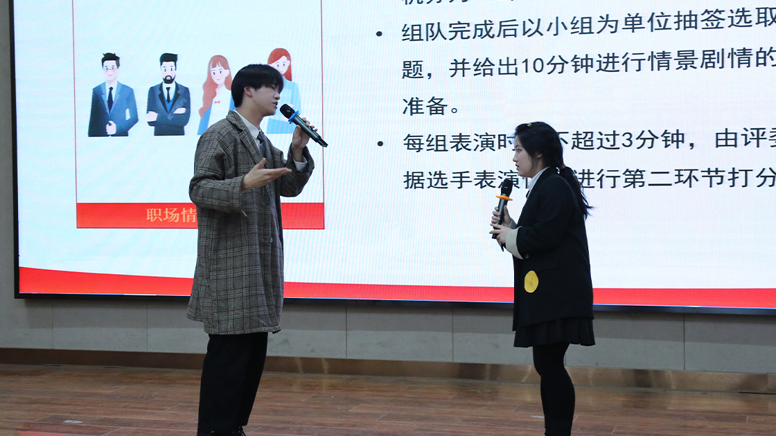 在即兴情景模拟环节,选手们两人一组,通过模拟职场情境即兴表演向观众与评委展示自己对职场的理解,体现了大学生在不同岗位上肩负的责任感与使命感。他们全情投入的表演的将现场氛围推到高潮,赢得评委老师的一致好评和在场同学的阵阵掌声。